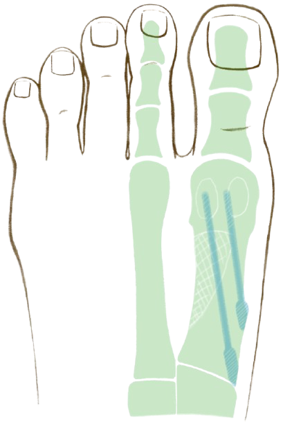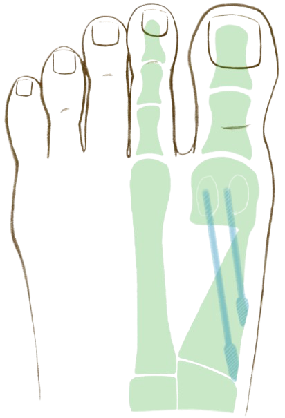 The head of the metatarsal bone is precisely shifted into a corrected position to realign the big toe. Two small but strong titanium screws are used to secure the bone in place, providing stability while allowing for weight bearing. These screws ensure long-lasting correction while promoting quicker healing and improved foot function.